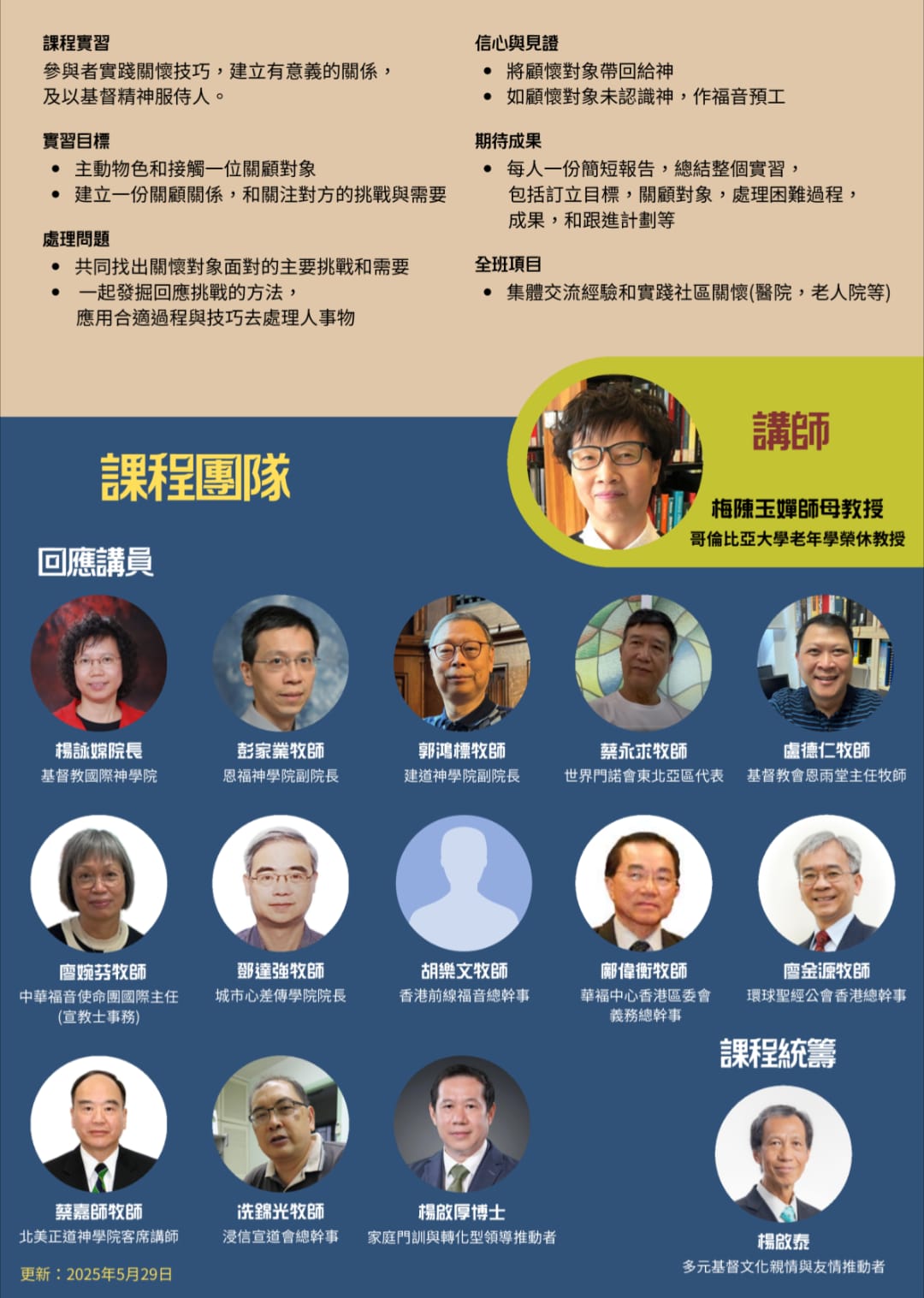 第 1 講:「成長、學習與事奉」 https://youtu.be/5YN9appLcHg 第 2 講:「保持身體健康榮耀上帝」 https://youtu.be/gYJ4-t4zRnw?si=7adePQQz0r0t5Ung 第 3 課:「保持心靈健康事奉上帝」 https://youtu.be/hkPhYMVXuuI 第 4 課:「認識自己.活出連結友情的智慧」 https://youtu.be/Z_pOxMWy6Ak 第 5 課:「攜手同行.活出婚姻相伴的智慧」 https://youtu.be/D8vtVCtB2-g 第 6 課:「代代同行.活出跨代共融的智慧」 https://youtu.be/58mTk1kdd8U 第 7 課:「陪伴的恩典.支持認知障礙者與家屬的信心之旅」 https://youtu.be/K8VRamyiD0M 第 8 課:「憐憫的眼光.理解大腦退化之路與應對之道」 https://youtu.be/wZFgjP8bXvQ 第 9 課:「服侍的力量.照顧者的重擔與從主而來的安慰」 https://youtu.be/DNj_hApUHDg 第 10 課:「憐憫的腳蹤.陪伴在憂鬱與哀傷中的心靈」 https://youtu.be/AMMqSA4y9FM 第 11 課:「恩典的終章.與主同行走向生命的畢業典禮」 https://youtu.be/bL9WWn0QGXc 第 12 課:「信實的記號.學習編寫見證神引領的生命故事」 https://youtu.be/U0TP955NQdA 第 13 課:「同心同行.教會如何啟動終生學習與服侍的陪伴事工」 https://youtu.be/0Gy5xyV7XFA